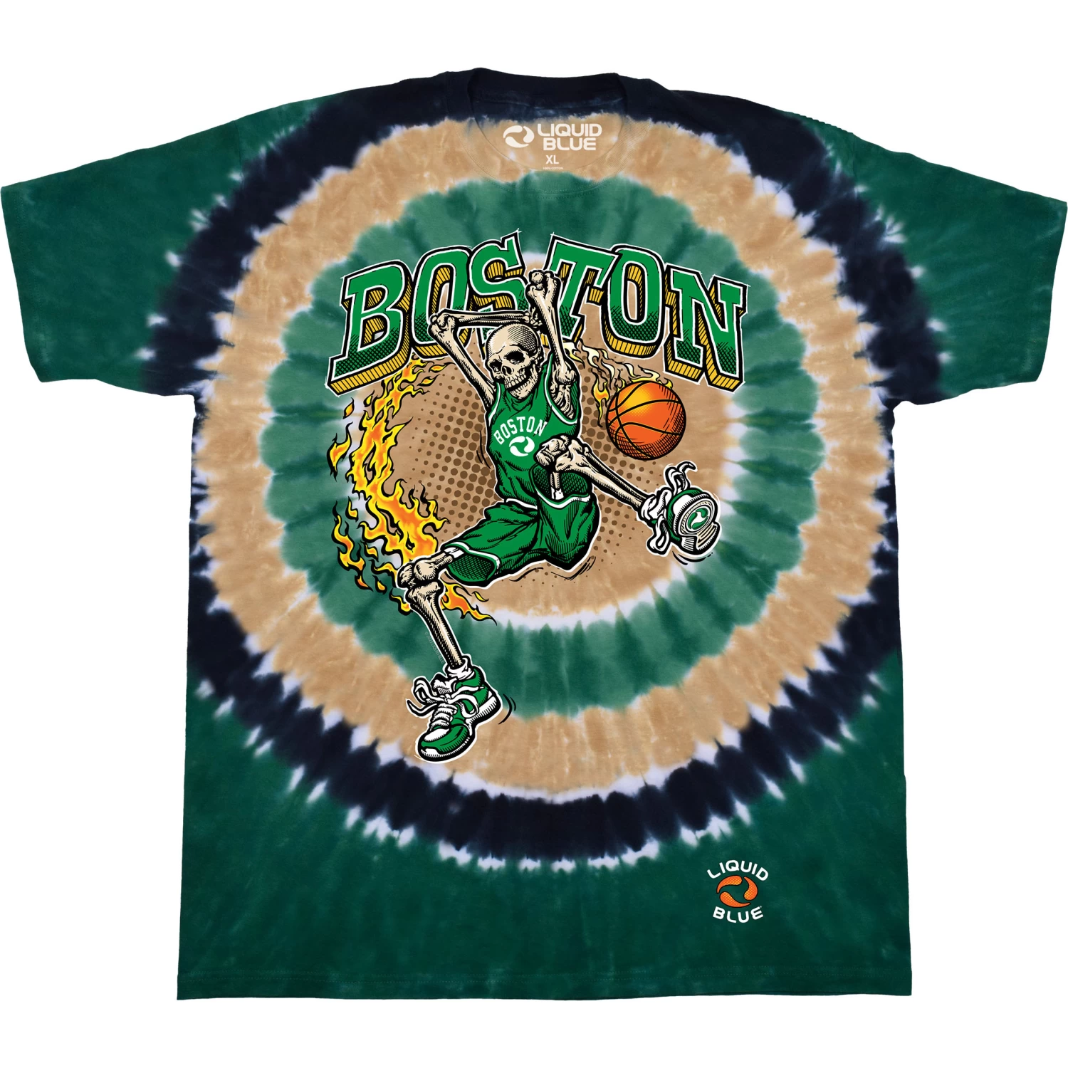 The Boston Dunker Basketball Skeleton Tie-Dye T-Shirt is made by Liquid Blue, a clothing company based in the USA. This direct screen-printed tee shirt features a unique design of a skeleton basketball player in the act of dunking a basketball with power. This great design is available in a Boston Irish green pride tie-dye. Liquid Blue is known for their high-quality apparel and excellence in making the best tie dyed and imprinted tee shirts in the USA. With colors that last longer than the seams.