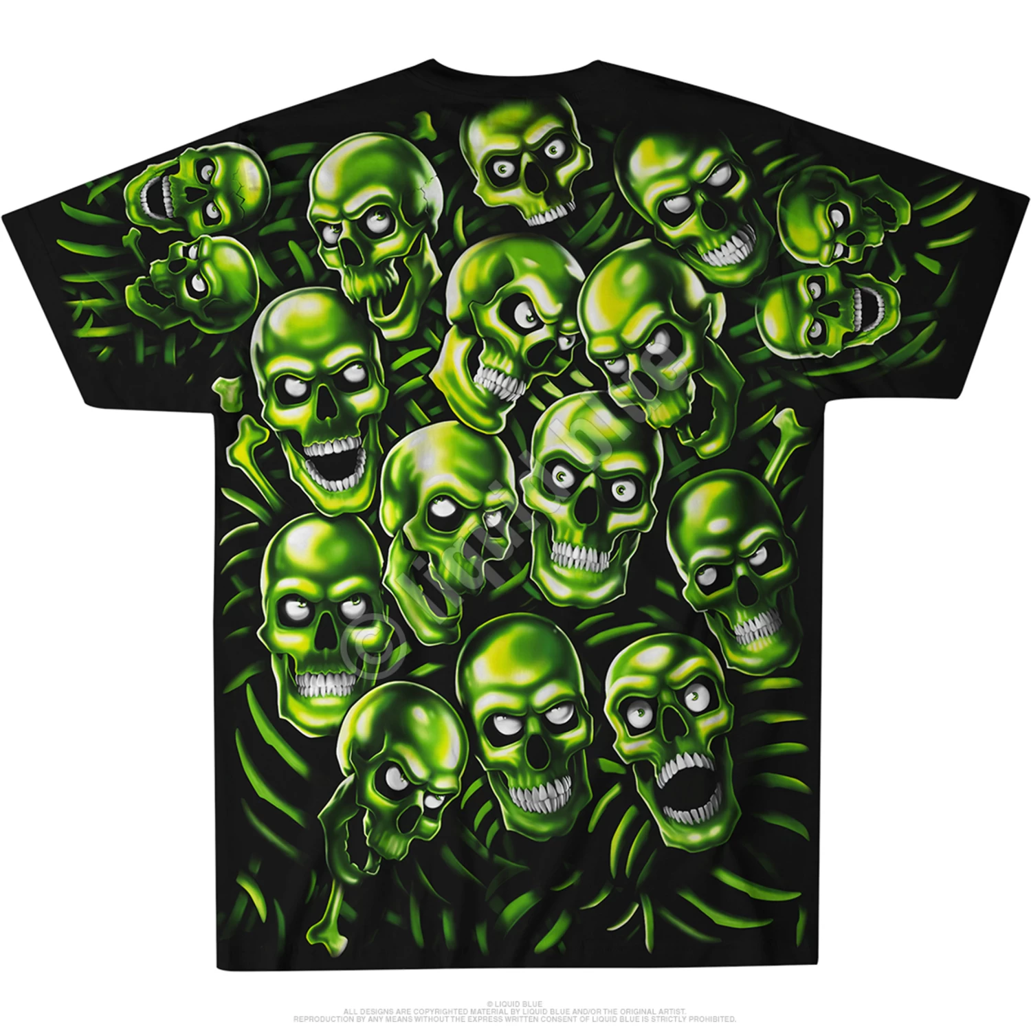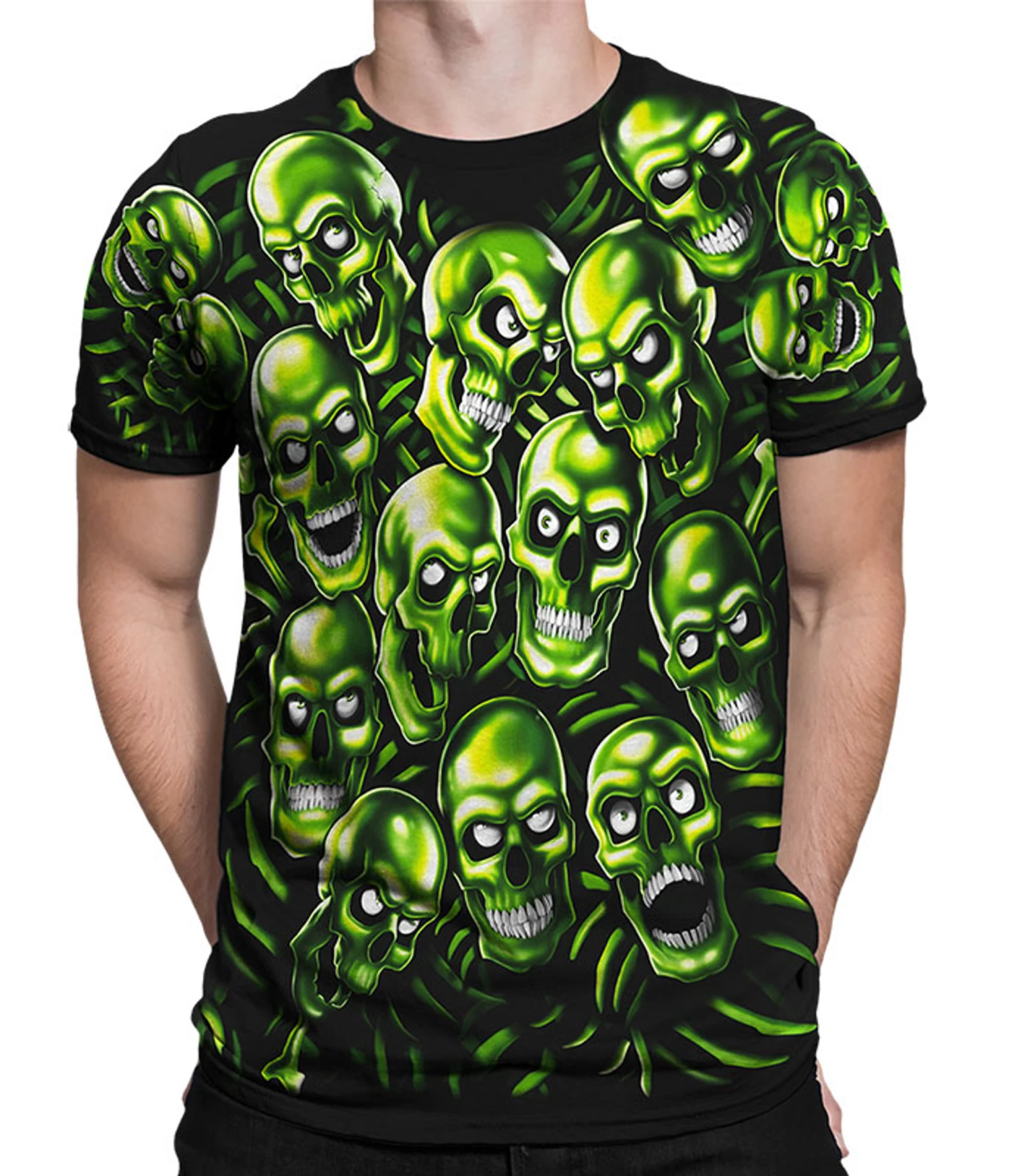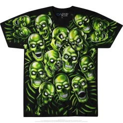 This green skull T-shirt features a stunning all-over print and glows in the dark. Rapper Juicy J The North Memphis Hustler is proudly clad in Skull Pile as seen on Three 6 Mafia’s “Stay Fly” music video from their 2005 release “The Known Unknowns”. Light up at your next house party or club, and don’t forget it’s perfect for Halloween. Recently worn on stage by Travis Scott.