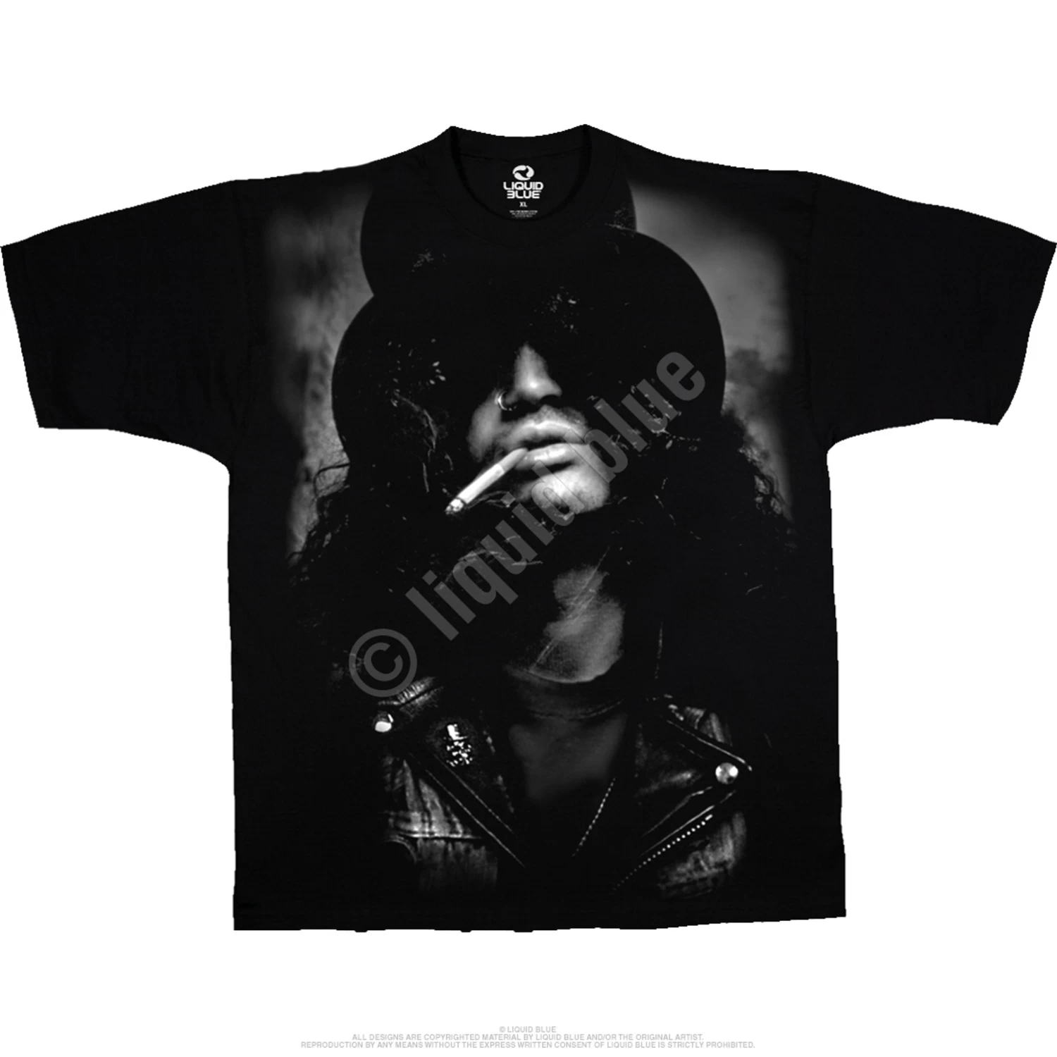 Although most know Slash for his contribution to Guns N’ Roses, he’s also been the driving force behind metal outfits such as Snakepit, Blues Ball, and Velvet Revolver. This Slash T-shirt features a piece of gear almost as recognizable as his Les Paul guitar, his funky top hat. In the pantheon of heavy metal monsters, Slash takes a backseat to no one.