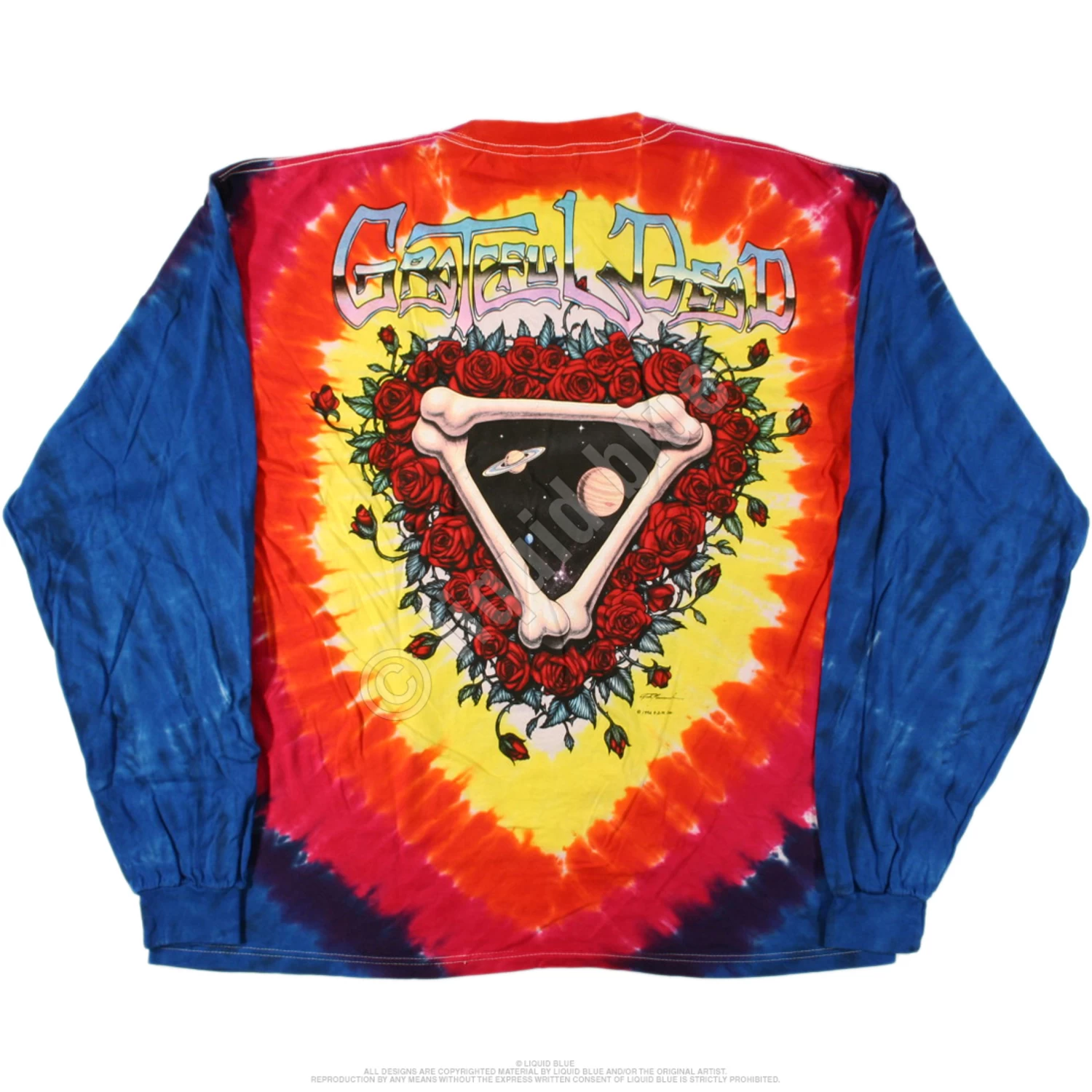 This Grateful Dead T-shirt features the classic Steal Your Face logo with an image of outer space in the place of the lightning bolt. The outer space image also appears on the back of the shirt, in between a triangle of bones…stunning!