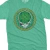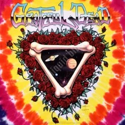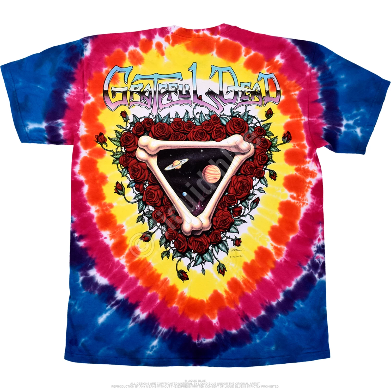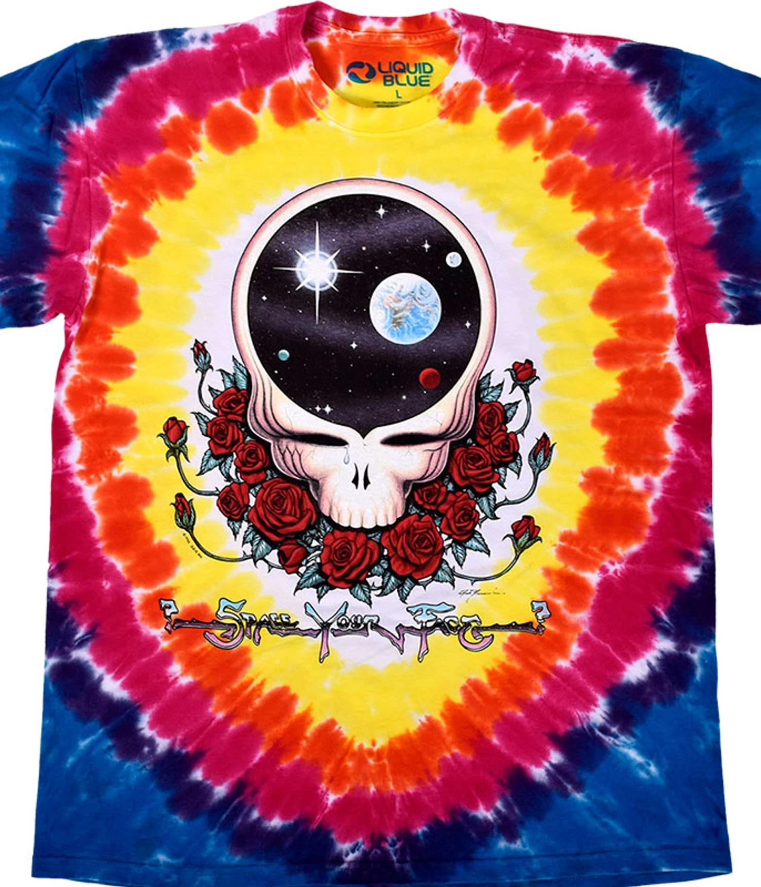 This Grateful Dead T-shirt features the classic Steal Your Face logo with an image of outer space in the place of the lightning bolt. The outer space image also appears on the back of the shirt, in between a triangle of bones…stunning!