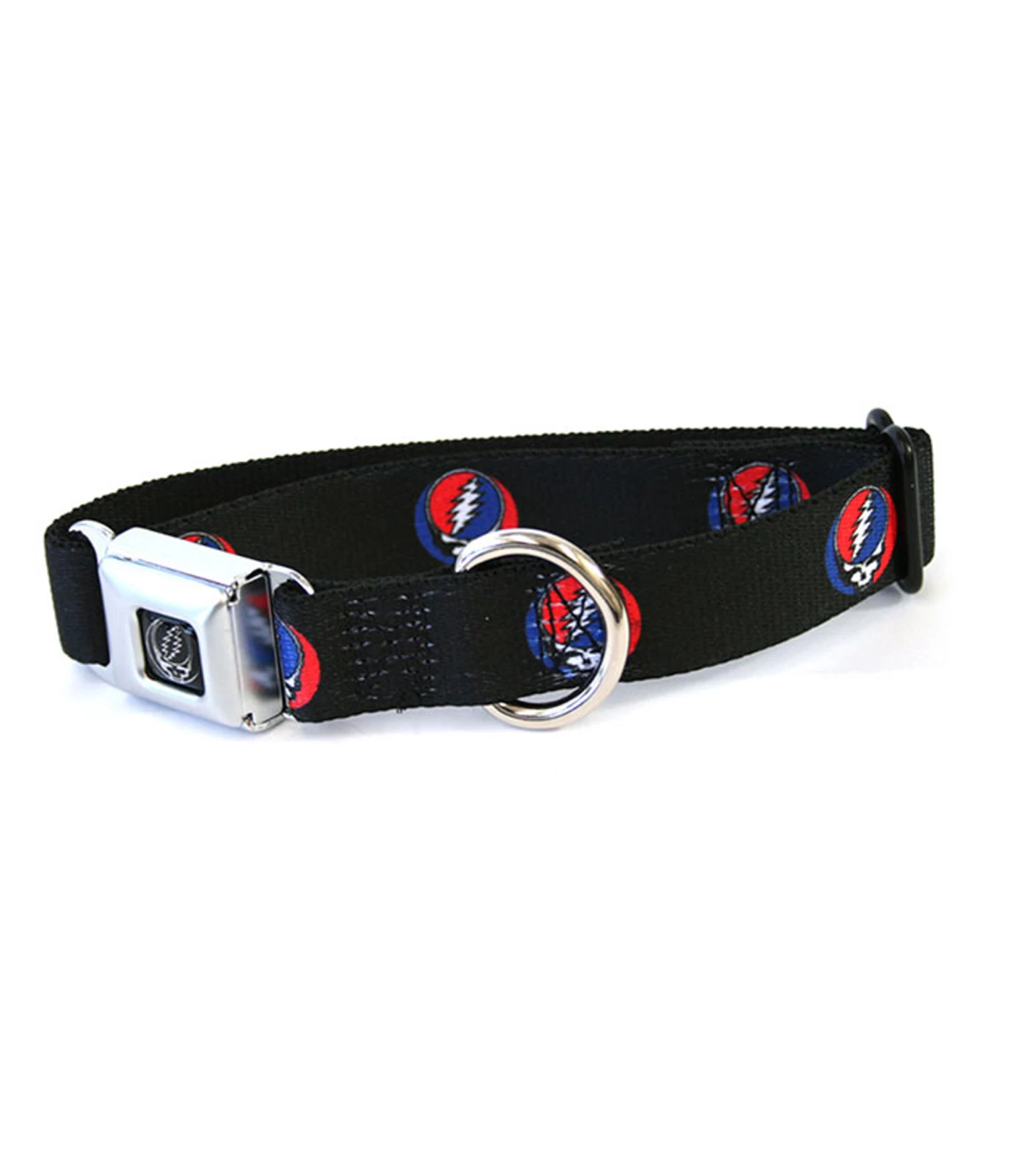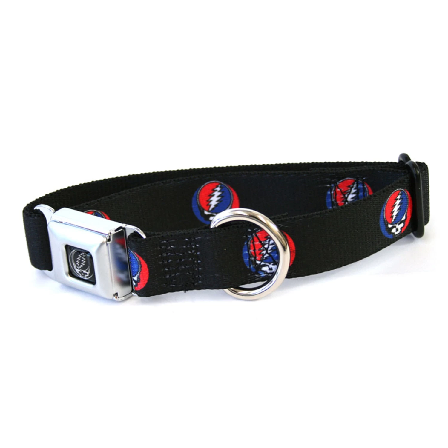 Small Dog Collar is 1 inch wide and fits 9 inch – 15 inch neck. Licensed Grateful Dead Dog Collars are made with a miniature seatbelt buckle which conveniently releases with the push of a button. The incredibly unique graphic work on a nylon strap is sure to catch the attention of everyone around. Product Features: Welded stainless steel D ring for leash attachment.