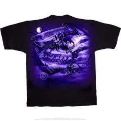This Fantasy T-shirt is a double-sided gem featuring some stunning detail. Our Fantasy line is known to be dark, provocative, and often breathtaking. It typically highlights skulls, dragons, fire, and death. Of course this shirt is 100% heavyweight cotton, pre-washed and pre-shrunk.