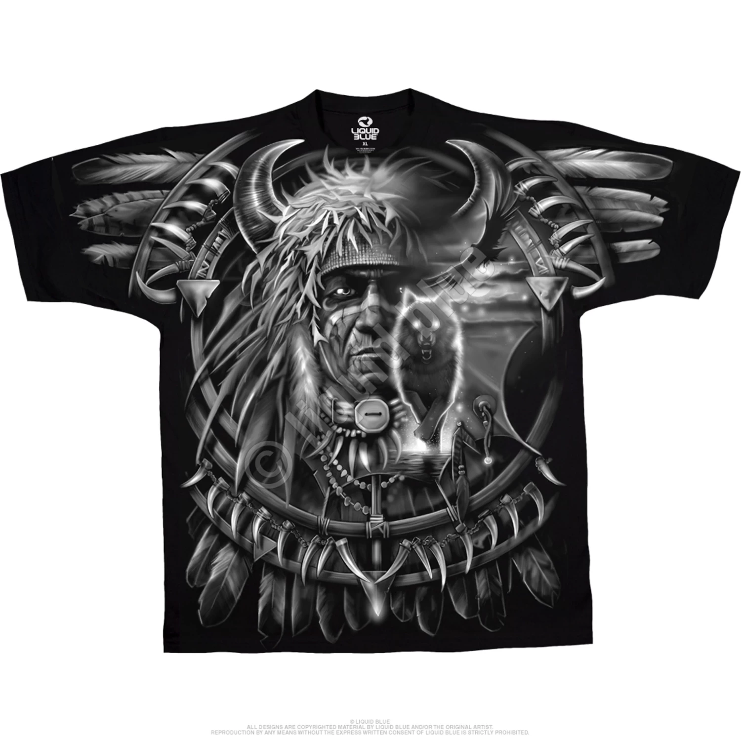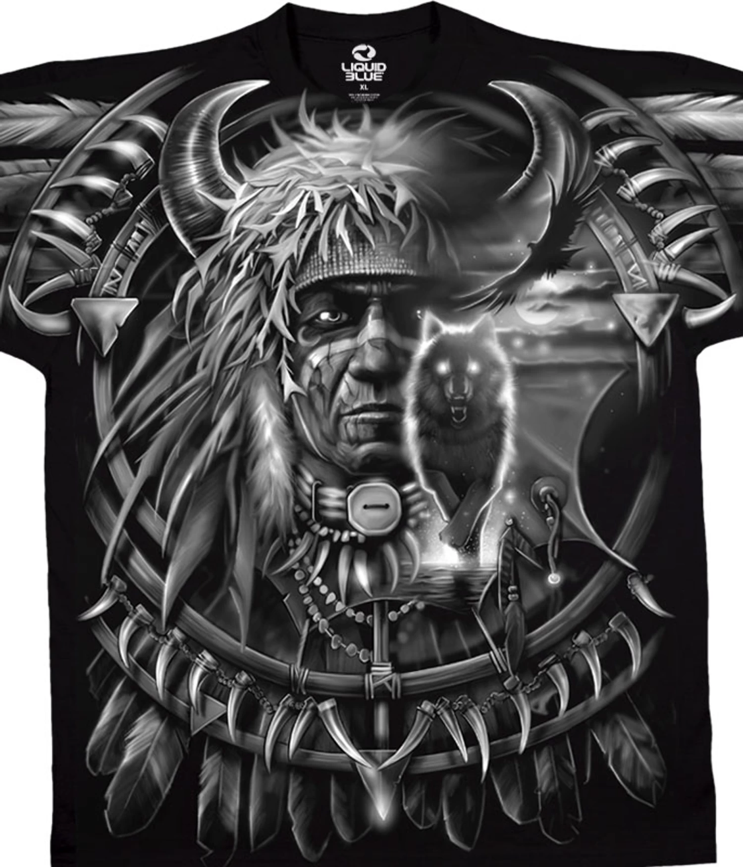 This Fantasy T-shirt features a Native American theme. Our Fantasy line is known to be dark, provocative, and often breathtaking. It typically highlights skulls, dragons, fire, and death. Of course this shirt is 100% heavyweight cotton, pre-washed and pre-shrunk.